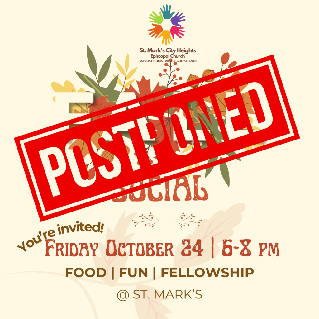 Everyone is invited to partake in our St. Mark’s fall social Friday, October 24, 6-8 pm. There will be food, fun and fellowship. The event is free and open to all. For questions, please talk to Debbie Kistler.